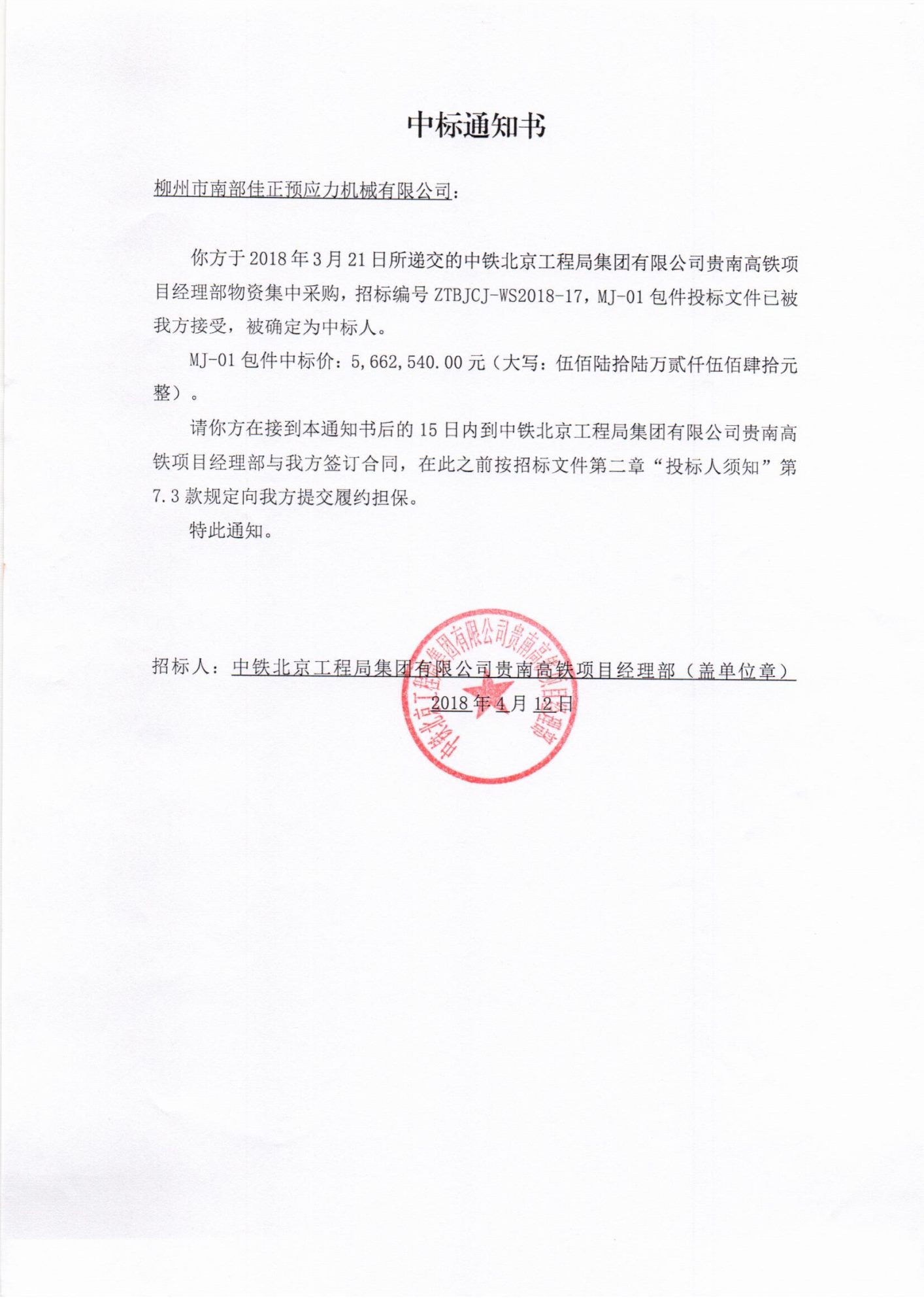 中鐵北京局貴南鐵路錨具中標(biāo)通知書